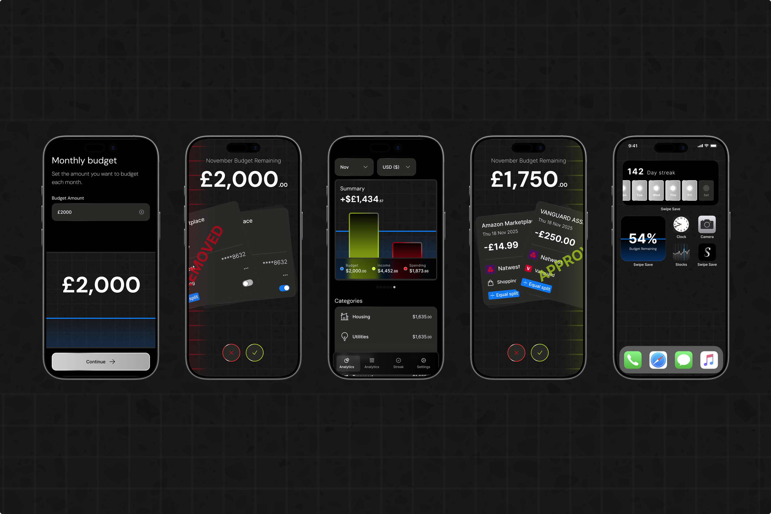 Swipe Save is a personal project I've been working on. It's a mobile budgeting app that connects directly to your bank accounts via Plaid and rethinks how people review and categorise their spending.