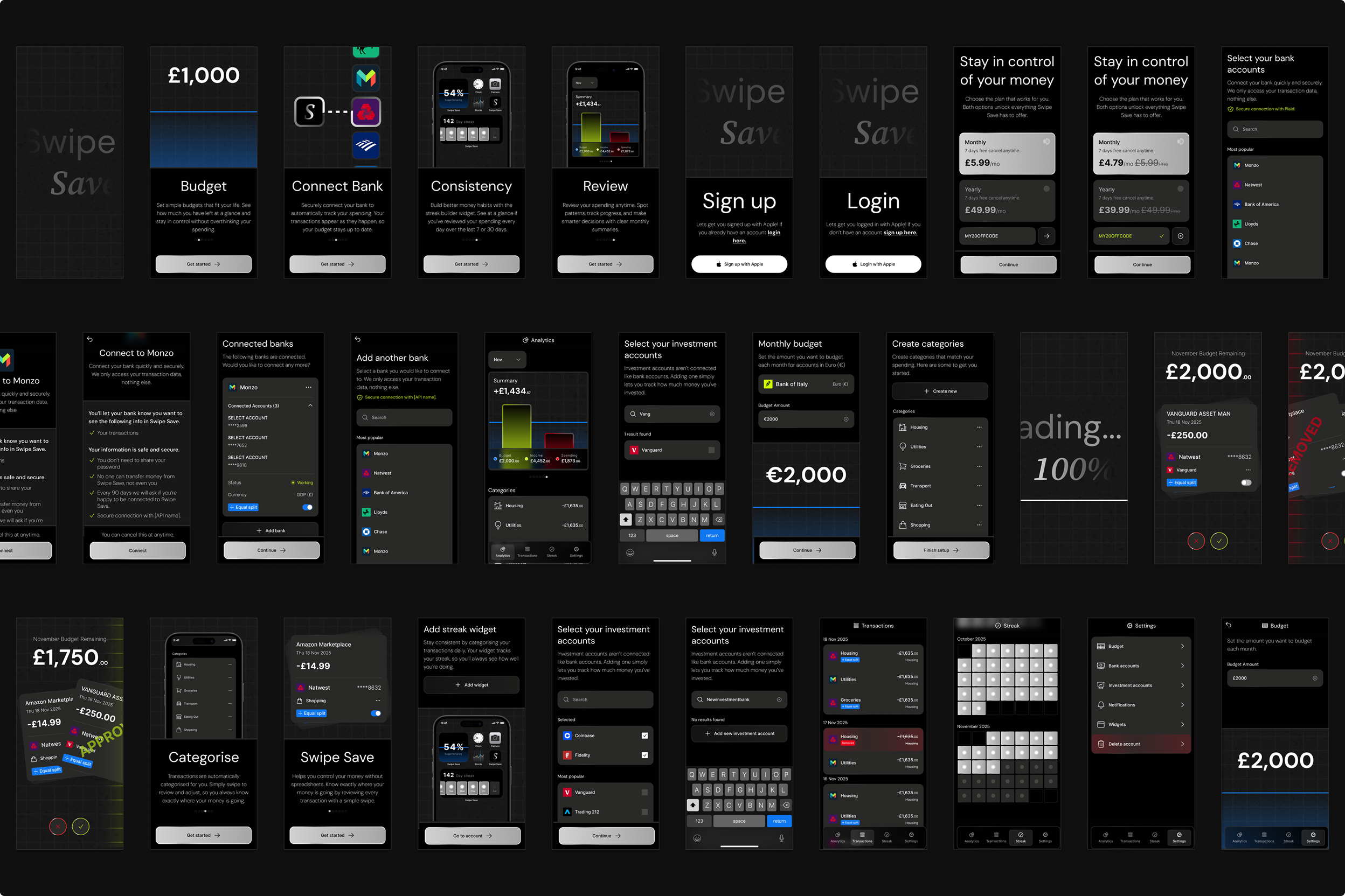 To better understand what works (and what doesn't), I screenshotted every screen of the budgeting apps I tested, analysing their onboarding flows and key interactions. This helped inform which patterns felt intuitive, which felt overwhelming, and where there was room to simplify and improve the experience.